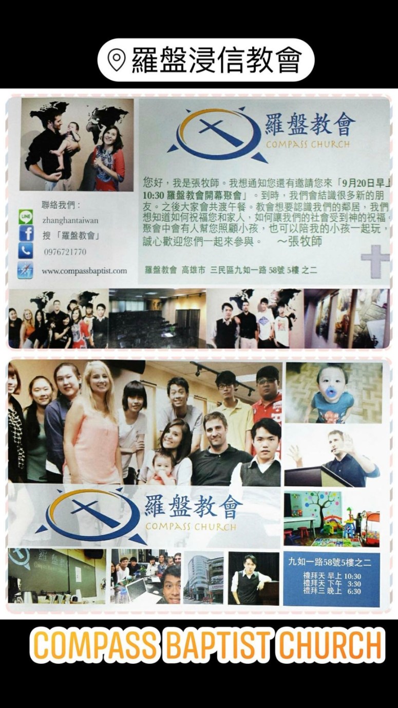 Three years ago today this flyer started off our first services in Taiwan. 60,000 flyers went out, we had three guests from flyers. Today, Compass Baptist Church is charted with 18 members who serve. We have 4 full time men in training for the ministry, people being grounded in God’s Word, and new guests every Sunday! God is good! Pray for Taiwan and for all the men in training. Through them, Lord willing, our hope is to plant 25 church’s in Kaohsiung, a city in Taiwan with a population of 2 million.